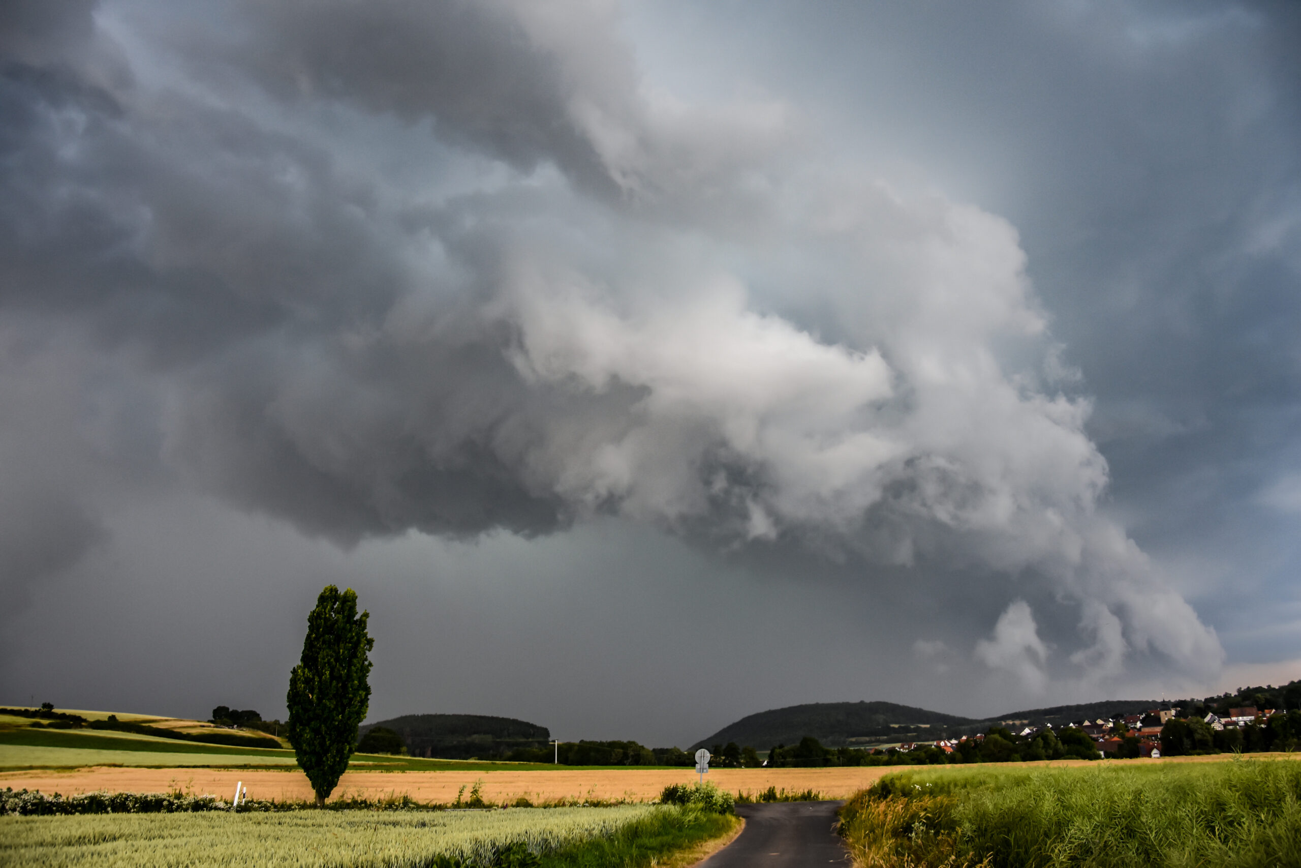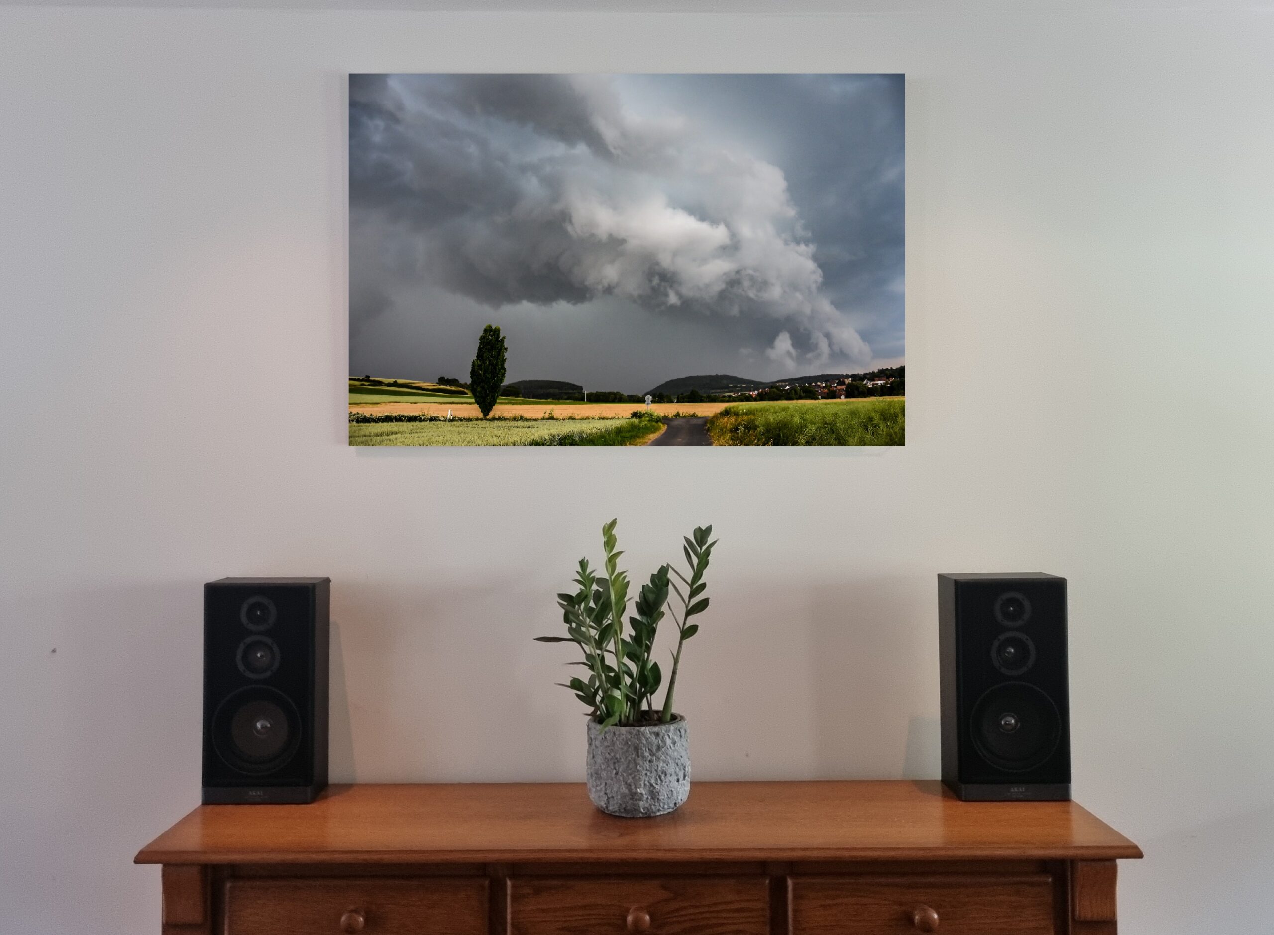 De foto toont een imposante, roterende wolkenmassa die de hemel vult met spanning en energie. De combinatie van de donkere lucht en het rustige landschap zorgt voor een indrukwekkend contrast dat een unieke sfeer oproept. Hierdoor is dit canvas kunstwerk ideaal voor zowel specifieke niches als een breder publiek dat houdt van natuur, sfeer en moderne woondecoratie.