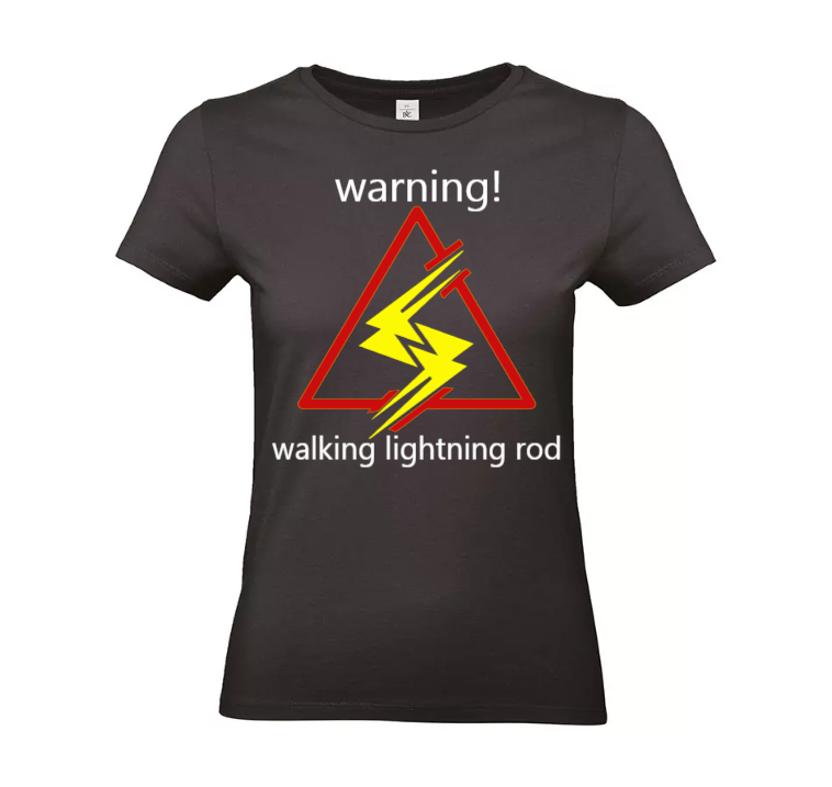 Het waarschuwingsontwerp – “warning! walking lightning rod” – sluit perfect aan bij de humor, energie en lef die zo kenmerkend zijn voor de stormchasing-community. Voor vrouwen die elke onweersbui achterna zouden rennen, resoneert dit shirt niet alleen als kledingstuk, maar als een stukje identiteit.